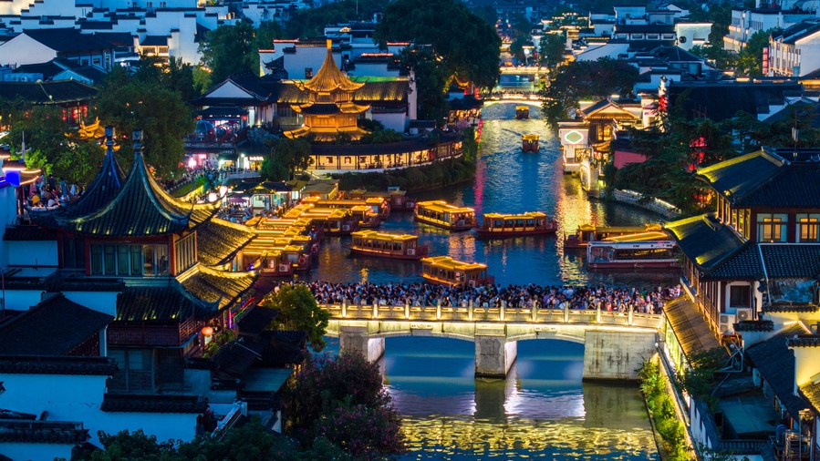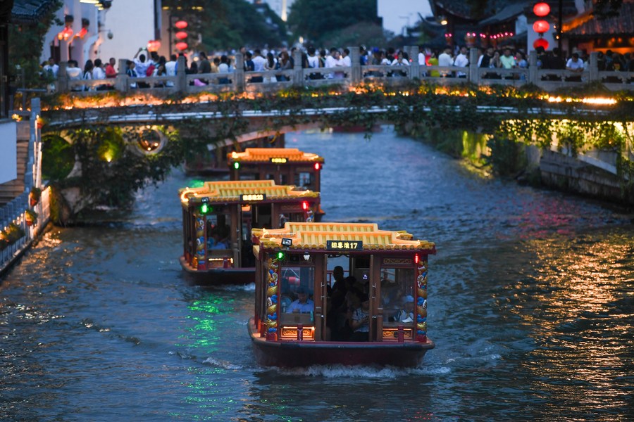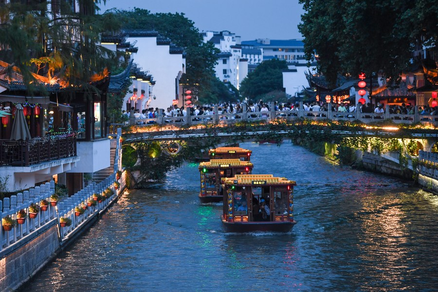 Tourists visit the Qinhuai River by boat in Nanjing, capital of east China's Jiangsu Province, Aug. 21, 2023. (Xinhua/Li Bo)