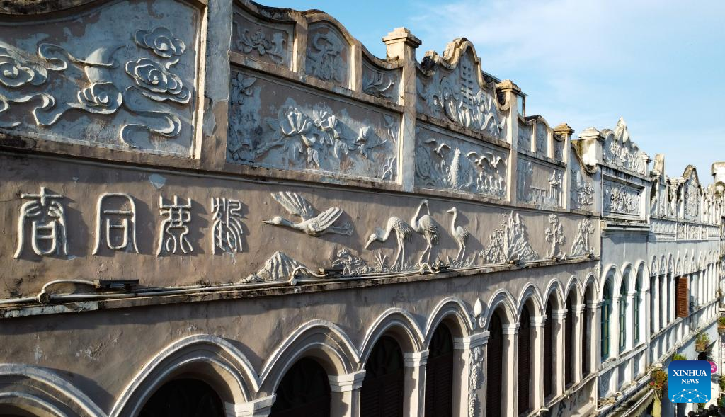 This photo taken on Aug. 21, 2023 shows part of buildings at the Qilou old street in Haikou, south China's Hainan Province. (Xinhua/Yang Guanyu)