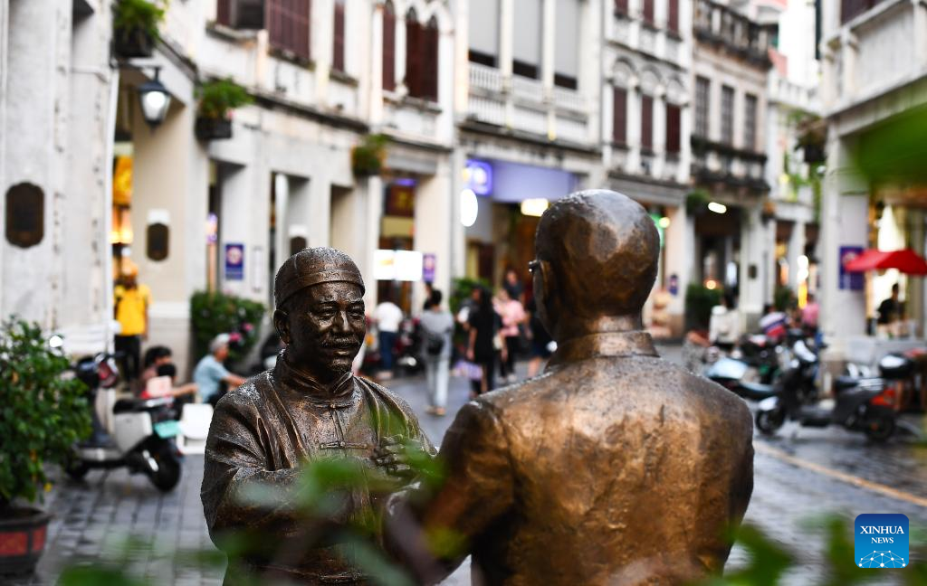 Statues are pictured at the Qilou old street in Haikou, south China's Hainan Province, Aug. 21, 2023. (Xinhua/Yang Guanyu)