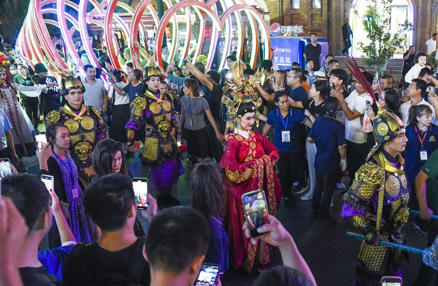 Actors perform at the Xinjiang International Grand Bazaar in Urumqi, northwest China's Xinjiang Uygur Autonomous Region, Aug. 28, 2023. (Xinhua/Wang Fei)