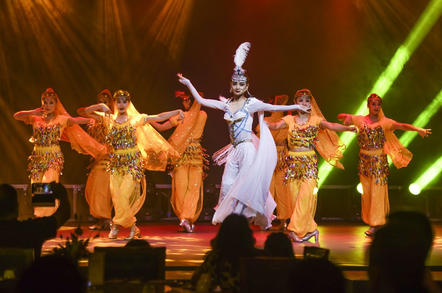 A performance is staged at the Xinjiang International Grand Bazaar in Urumqi, northwest China's Xinjiang Uygur Autonomous Region, Aug. 16, 2023. (Xinhua/Wang Fei)