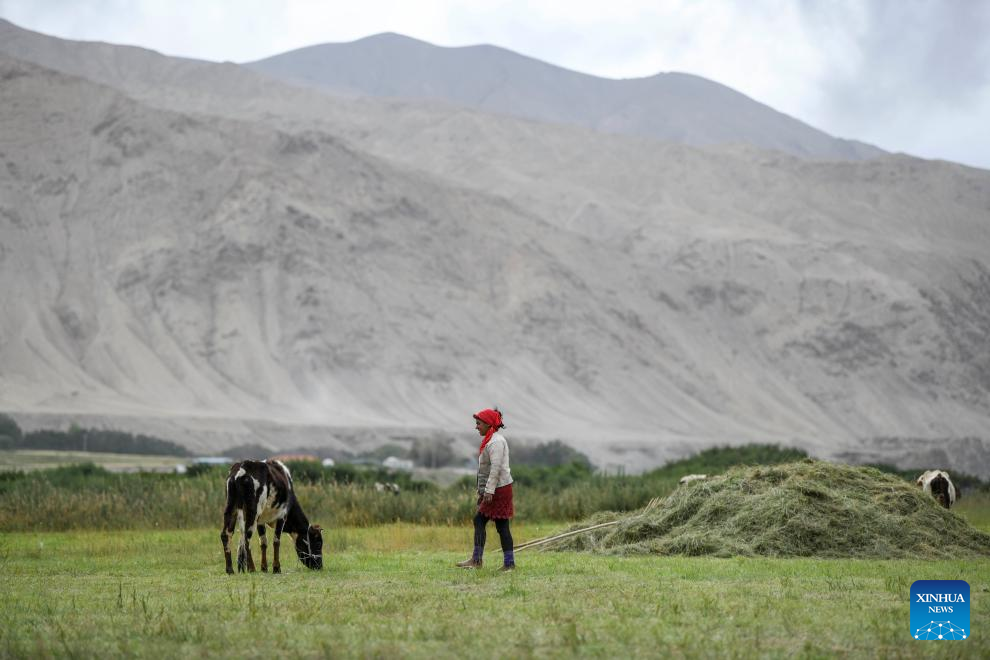 A herdswoman grazes cattle on a pasture in Taxkorgan Tajik Autonomous County, northwest China's Xinjiang Uygur Autonomous Region, Aug. 28, 2023. August and September are the annual forage grass harvest season for people living in the pasturing area in Xinjiang. Herdsmen in Taxkorgan Tajik Autonomous County, which is to the east foot of the Pamirs, have been busily preparing winter forage for their livestock recently. (Xinhua/Hu Huhu)