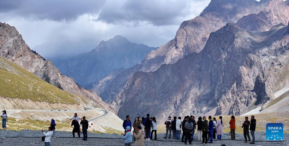 This aerial photo taken on Aug. 23, 2023 shows tourists gathering near Duku Highway in northwest China's Xinjiang Uygur Autonomous Region. The Duku Highway, deemed one of China's most beautiful roads, is a scenic mountainous section spanning over 500 kilometers between Dushanzi and Kuqa on China's National Highway 217 in Xinjiang. A major road linking northern and southern Xinjiang, Duku Highway is also famous for its spectacular natural landscape including glaciers, forests, and grasslands. (Xinhua/Wang Peng)