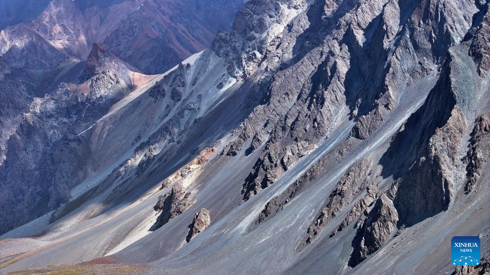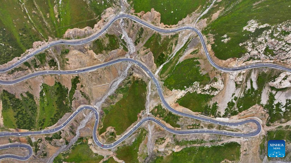 This aerial photo taken on Aug. 22, 2023 shows the view along Duku Highway in northwest China's Xinjiang Uygur Autonomous Region. The Duku Highway, deemed one of China's most beautiful roads, is a scenic mountainous section spanning over 500 kilometers between Dushanzi and Kuqa on China's National Highway 217 in Xinjiang. A major road linking northern and southern Xinjiang, Duku Highway is also famous for its spectacular natural landscape including glaciers, forests, and grasslands. (Xinhua/Wang Peng)