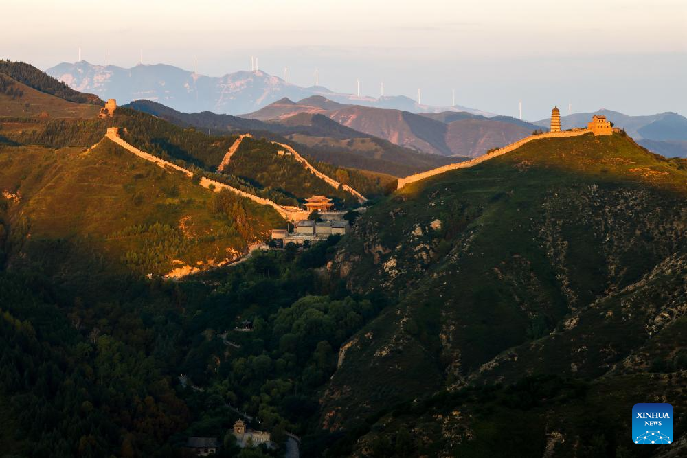 This aerial photo taken on Aug. 29, 2023 shows the Yanmen Pass in Daixian County, north China's Shanxi Province. The Yanmen Pass is a famed part of the Great Wall. The Great Wall, a UNESCO World Heritage Site, consists of many interconnected walls, some dating back 2,000 years. (Xinhua/Yang Chenguang)