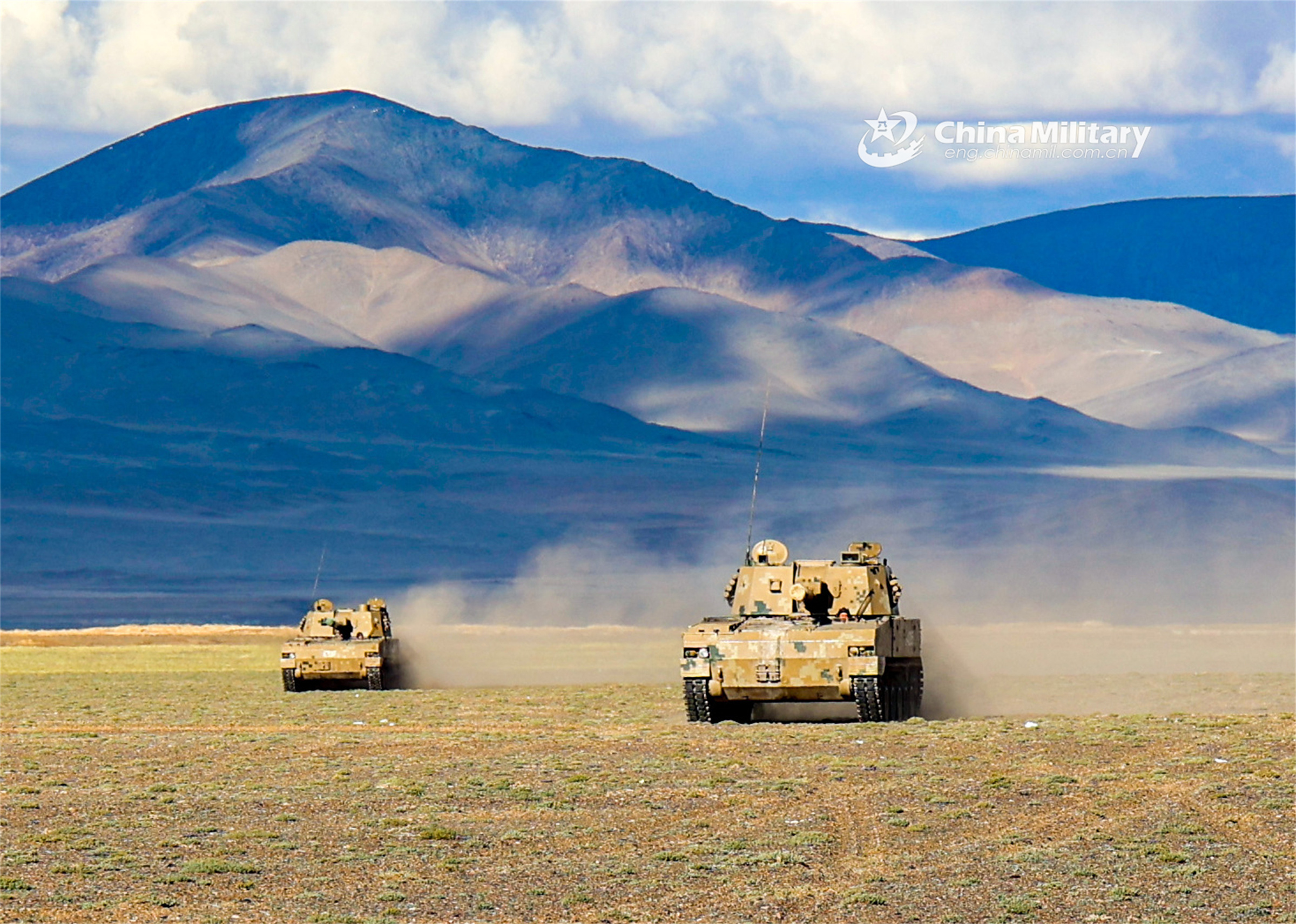 Armored vehicles attached to an army artillery element maneuver in speed en route to the designated area for a live-fire training exercise on August 21, 2023. (eng.chinamil.com.cn/Photo by Shi Jinguang)