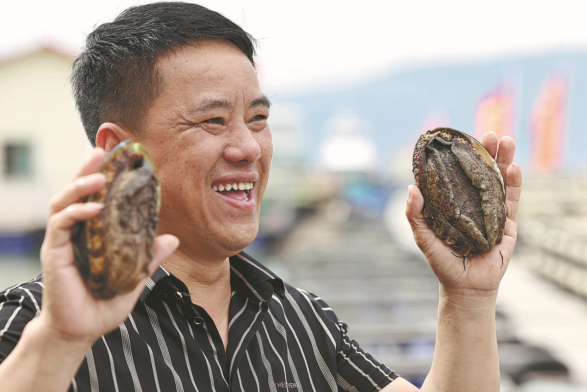 A fish farmer displays abalones he is raising on a fishing platform at Sandu'ao Bay, Ningde city, Fujian province, on June 18. ZHU XINGXIN/CHINA DAILY