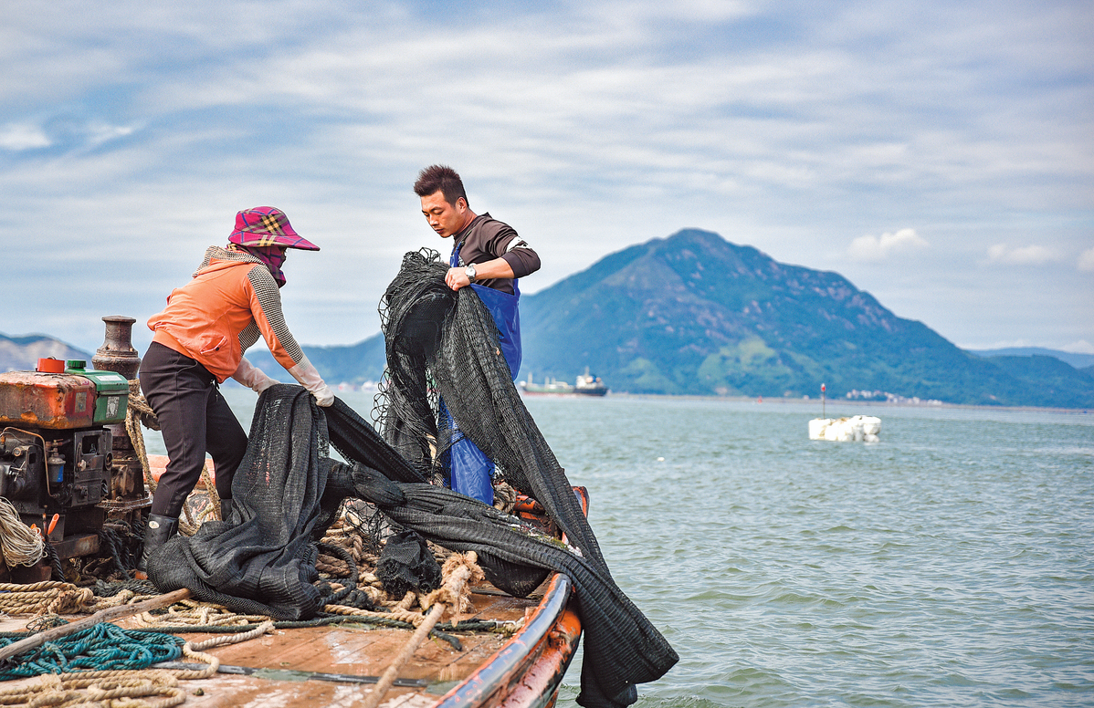 Fishermen tie up a net on a boat moored near Jiaocheng district, Ningde, on Oct 18, 2021. RUAN CHUANLONG/FOR CHINA DAILY