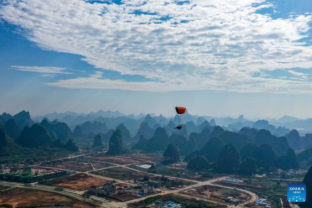 In this aerial photo, a tourist parasails with a coach in Guilin, south China's Guangxi Zhuang Autonomous Region, Sept. 5, 2023. (Xinhua/Hu Xingyu)
