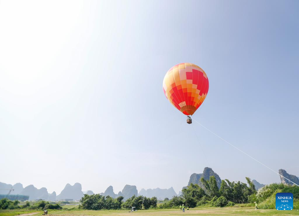 Tourists take a hot air balloon in Guilin, south China's Guangxi Zhuang Autonomous Region, Sept. 5, 2023. (Xinhua/Hu Xingyu)