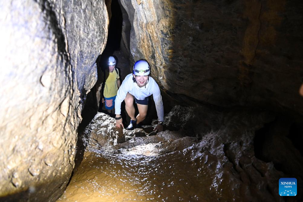 Tourists explore a cave in Guilin, south China's Guangxi Zhuang Autonomous Region, Sept. 6, 2023. (Xinhua/Cao Yiming)