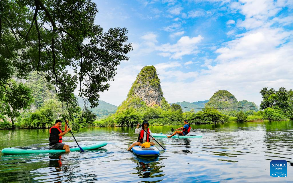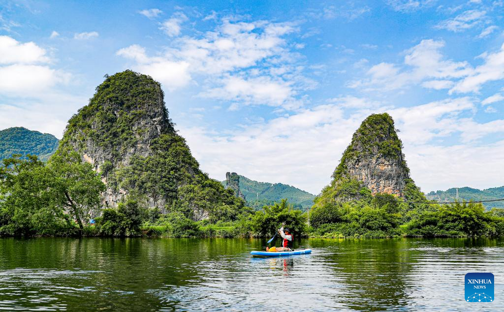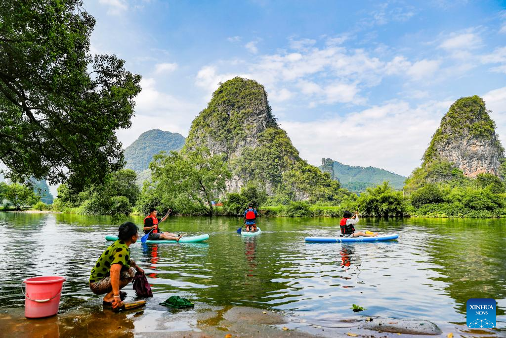 Tourists paddle on a river in Guilin, south China's Guangxi Zhuang Autonomous Region, Sept. 6, 2023. (Xinhua/Hu Xingyu)