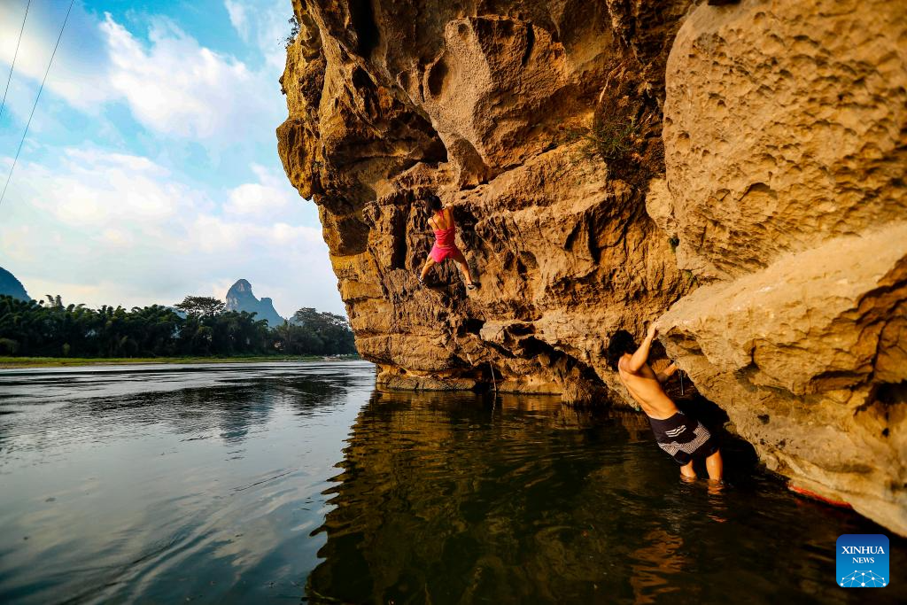 Enthusiasts conduct deep water soloing in Guilin, south China's Guangxi Zhuang Autonomous Region, Sept. 5, 2023. (Xinhua/Hu Xingyu)