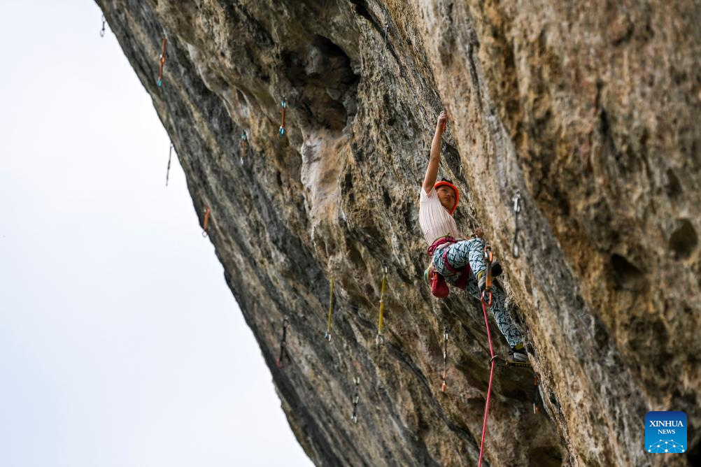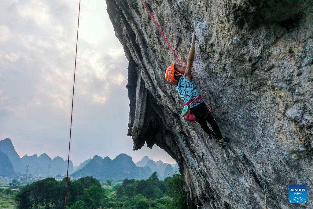 An enthusiast rock-climbs in Guilin, south China's Guangxi Zhuang Autonomous Region, Sept. 5, 2023. (Xinhua/Hu Xingyu)