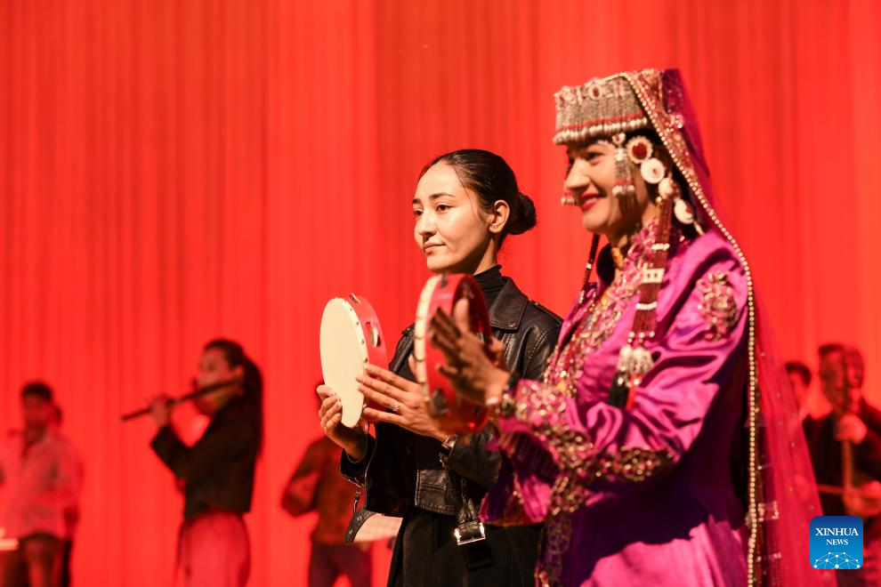 Artists of a local art troupe rehearse a program in Taxkorgan Tajik Autonomous County, northwest China's Xinjiang Uygur Autonomous Region, Sept. 7, 2023. Taxkorgan Tajik Autonomous County has made great efforts in the integration of local culture and tourism in recent years, enriching the cultural life of people and promoting foreign exchanges. The county also carries forward traditional Chinese culture to build cultural tourism festivals, which shows the scenery of the Pamir Plateau and the happy and stable life of the people. (Xinhua/Hu Huhu)