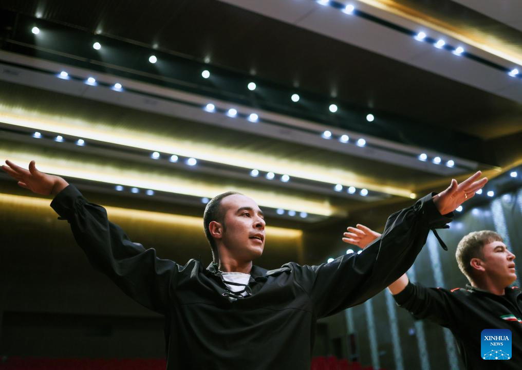 Artists of a local art troupe rehearse a program in Taxkorgan Tajik Autonomous County, northwest China's Xinjiang Uygur Autonomous Region, Sept. 4, 2023. Taxkorgan Tajik Autonomous County has made great efforts in the integration of local culture and tourism in recent years, enriching the cultural life of people and promoting foreign exchanges. The county also carries forward traditional Chinese culture to build cultural tourism festivals, which shows the scenery of the Pamir Plateau and the happy and stable life of the people. (Xinhua/Cheng Tingting)