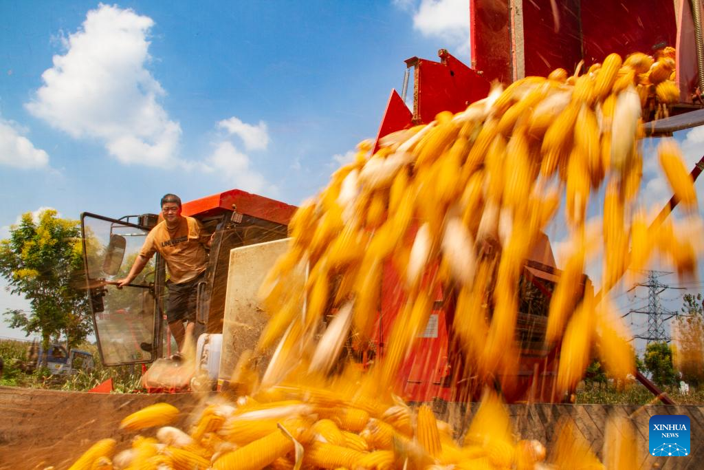 A farmer drives a harvester to harvest corns in Yuanzhuang Village of Zhumadian, central China's Henan Province, Sept. 14, 2023. (Photo by Sun Kai/Xinhua)
