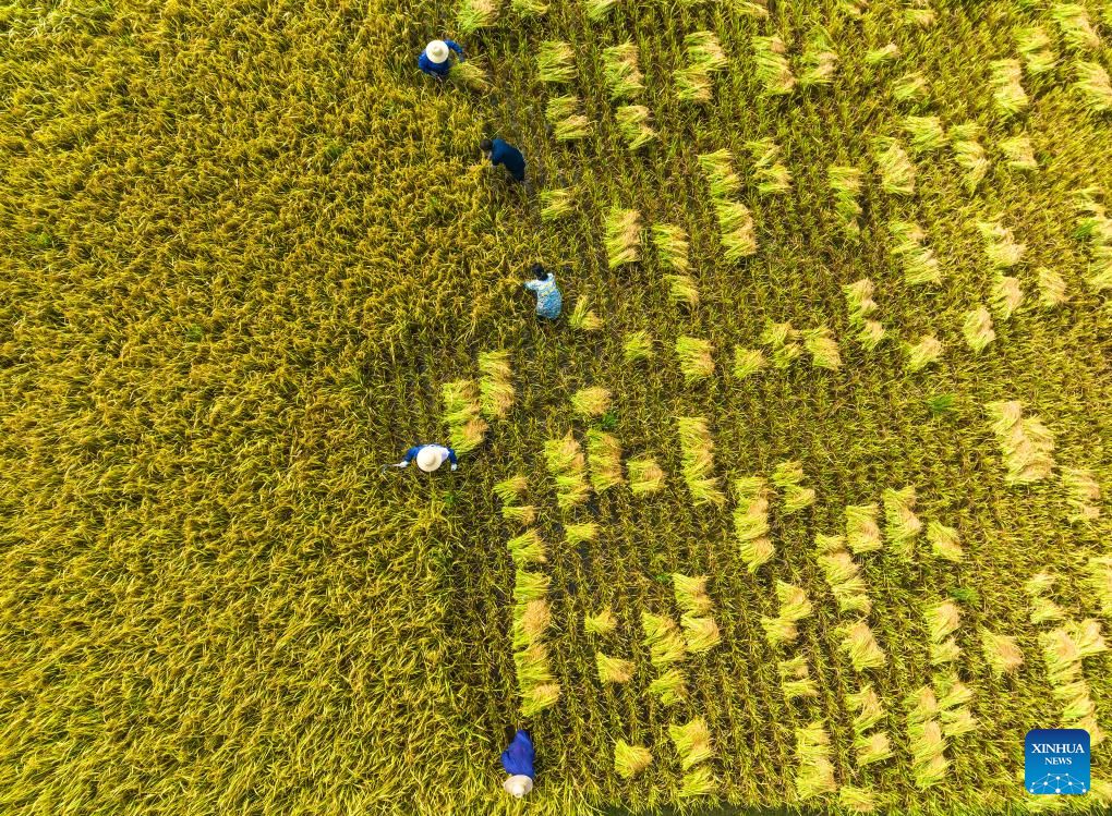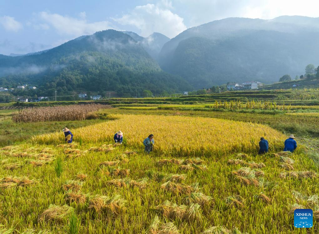 This aerial photo shows farmers harvesting rice in the field in Shizhu Village of Zigui County, central China's Hubei Province, Sept. 14, 2023. (Photo by Wang Gang/Xinhua)