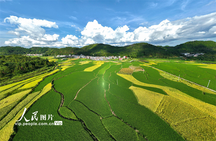 Photo shows rice fields under the blue sky in Liufeng townsip, Guiyang county, Chenzhou city, central China's Hunan Province. (vip.people.com.cn/ Zhou Xiuyuchun)