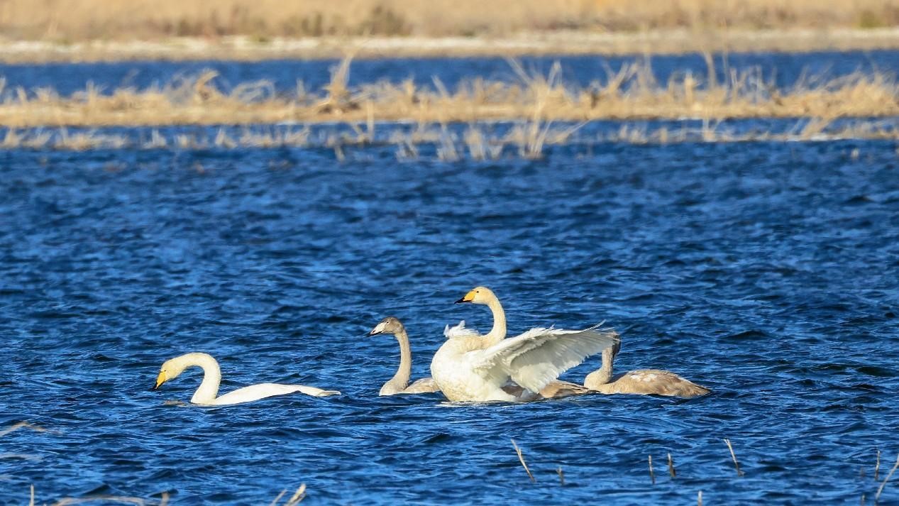 Swans play and forage on the Bosten Lake in Bayingolin Mongolian autonomous prefecture, northwest China's Xinjiang Uygur autonomous region. (People's Daily Online/Nian Lei)