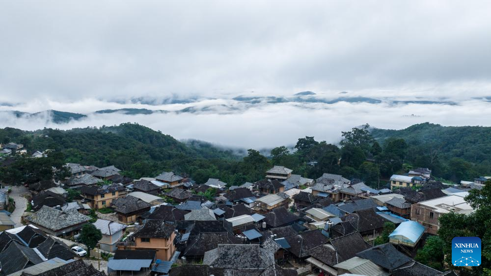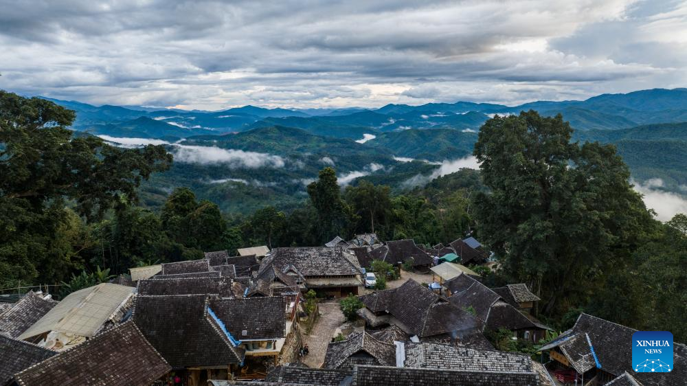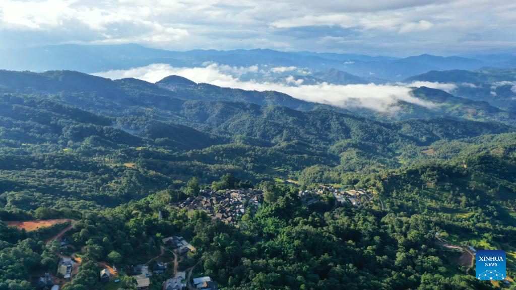 This aerial photo taken on Sept. 14, 2023 shows the Nuogang Village in Pu'er City, southwest China's Yunnan Province. The Cultural Landscape of Old Tea Forests of Jingmai Mountain in Pu'er was inscribed on the UNESCO World Heritage List on Sunday at the extended 45th session of the UNESCO World Heritage Committee in Riyadh, Saudi Arabia, making it China's 57th World Heritage Site. (Xinhua/Hu Chao)