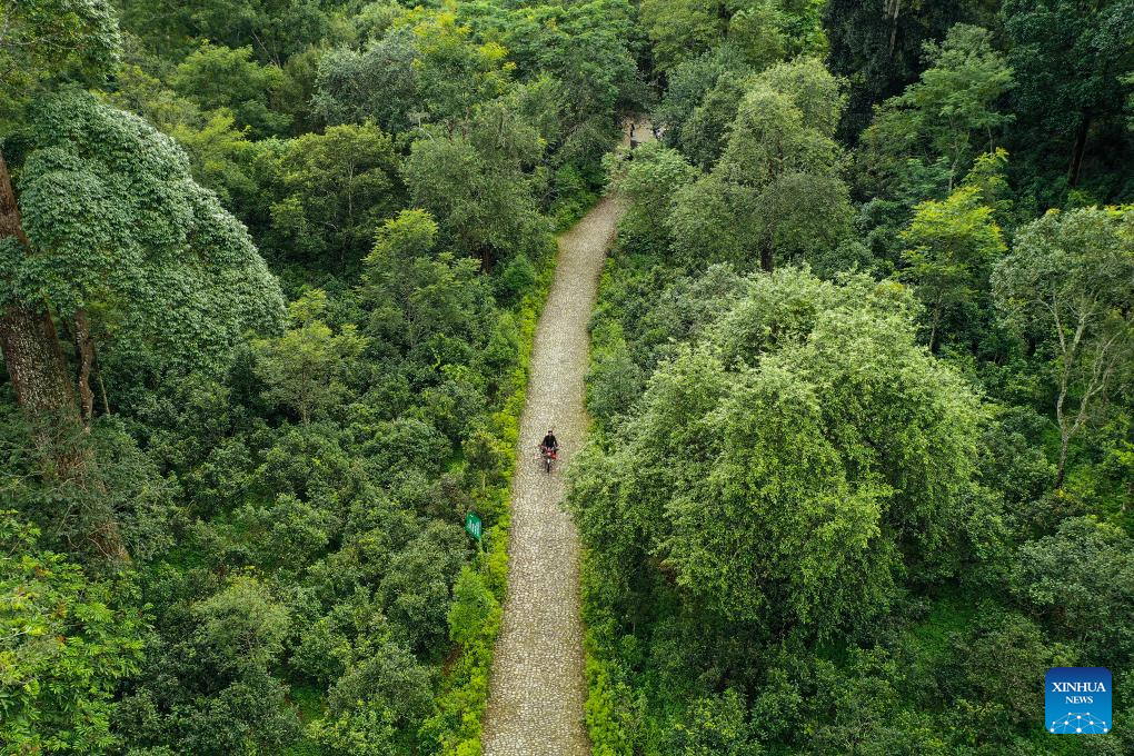 This aerial photo taken on Sept. 17, 2023 shows the road in Wengji Village of Pu'er City, southwest China's Yunnan Province. The Cultural Landscape of Old Tea Forests of Jingmai Mountain in Pu'er was inscribed on the UNESCO World Heritage List on Sunday at the extended 45th session of the UNESCO World Heritage Committee in Riyadh, Saudi Arabia, making it China's 57th World Heritage Site. (Xinhua/Tang Rufeng)