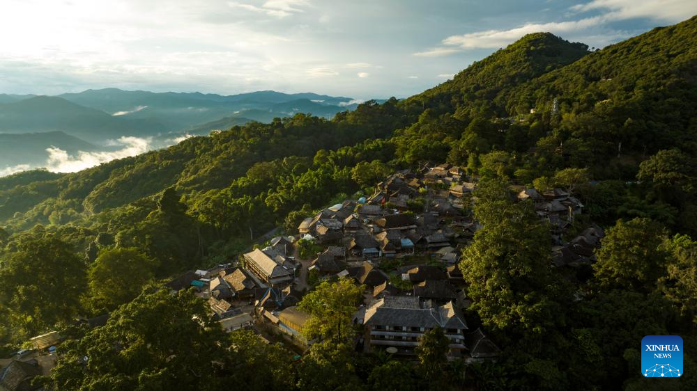 This aerial photo taken on Sept. 18, 2023 shows the Wengji Village at sunset in Pu'er City, southwest China's Yunnan Province. The Cultural Landscape of Old Tea Forests of Jingmai Mountain in Pu'er was inscribed on the UNESCO World Heritage List on Sunday at the extended 45th session of the UNESCO World Heritage Committee in Riyadh, Saudi Arabia, making it China's 57th World Heritage Site. (Xinhua/Hu Chao)