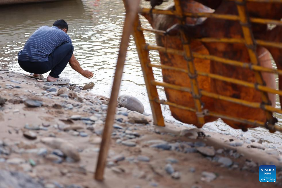 Niu Qiang washes his hands beside the Yellow River in Lanzhou, northwest China's Gansu Province, Sept. 5, 2023. Niu Qiang, a sheepskin raft worker from Huining of northwest China's Gansu Province, has been doing the job for 27 years since 16 years old on the Lanzhou section of the Yellow River. (Xinhua/Xing Guangli)