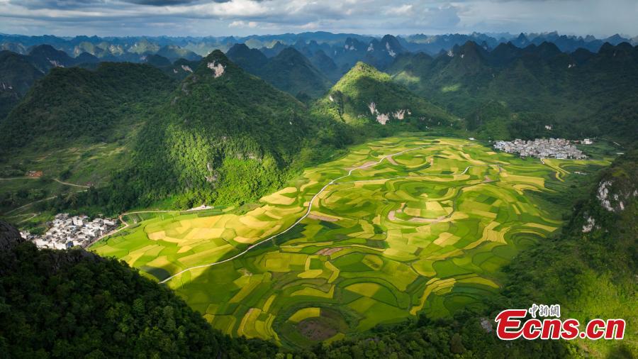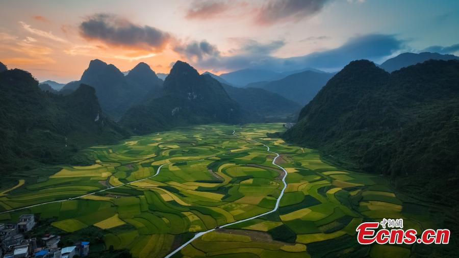 Picturesque scenery of terraced late rice field at sunset in Debao County of Baise, south China's Guangxi Zhuang Autonomous Region. (Photo: China News Service/Huang Shaojiang)