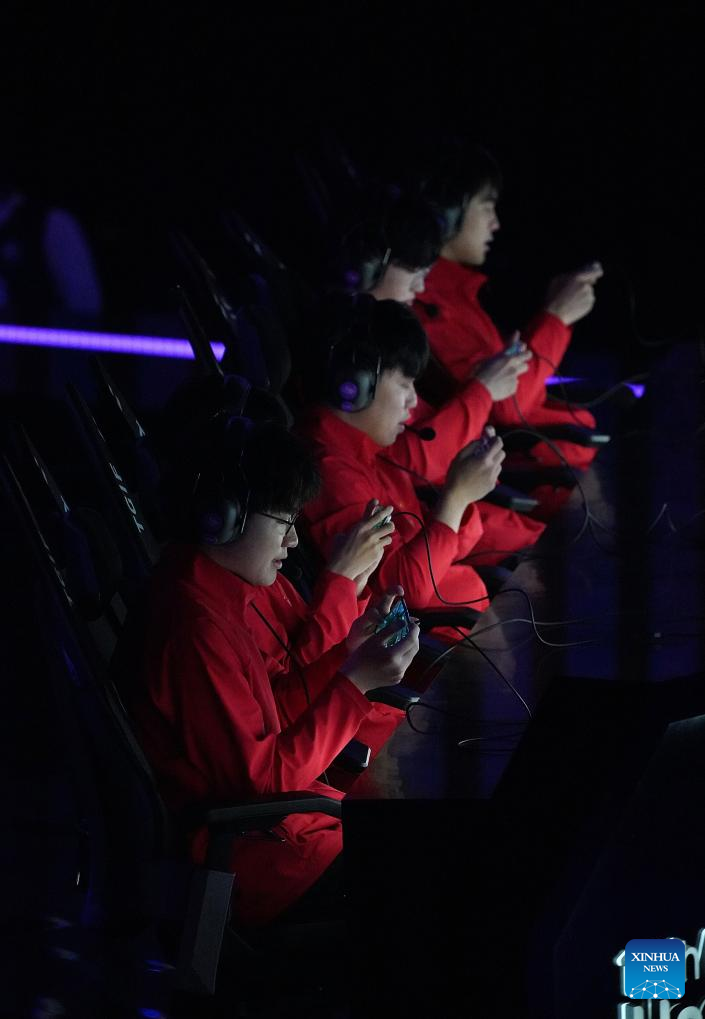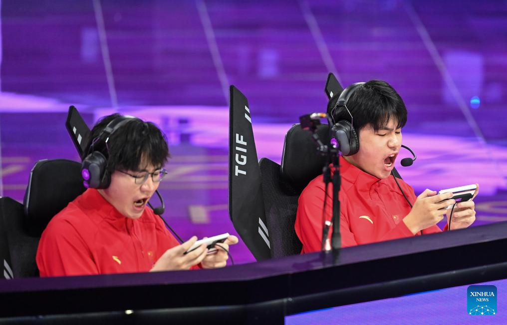 Players of team China compete during the Arena of Valor Asian Games Version Final match of Esports at the 19th Asian Games in Hangzhou, east China's Zhejiang Province, Sept. 26, 2023. (Xinhua/Han Chuanhao)