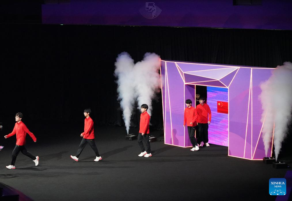 Players of team China prepare before the Arena of Valor Asian Games Version Final match of Esports at the 19th Asian Games in Hangzhou, east China's Zhejiang Province, Sept. 26, 2023. (Xinhua/Han Chuanhao)