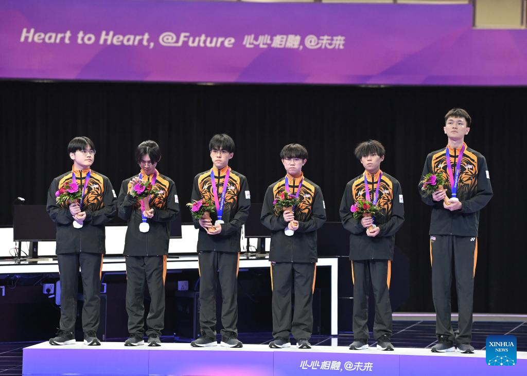 Silver Medalists of team Malaysia attend the awarding ceremony for the Arena of Valor Asian Games Version of Esports at the 19th Asian Games in Hangzhou, east China's Zhejiang Province, Sept. 26, 2023. (Xinhua/Yan Linyun)