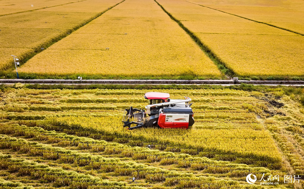 A harvester reaps rice on a field in Ulanhot city, north China's Inner Mongolia Autonomous Region. (Photo/Shi Jiamin)