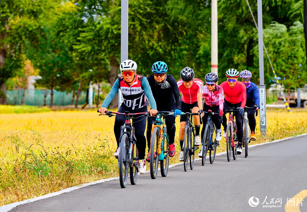 Cyclists ride on a road near rice fields in Ulanhot city, north China's Inner Mongolia Autonomous Region. (Photo/Shi Jiamin)