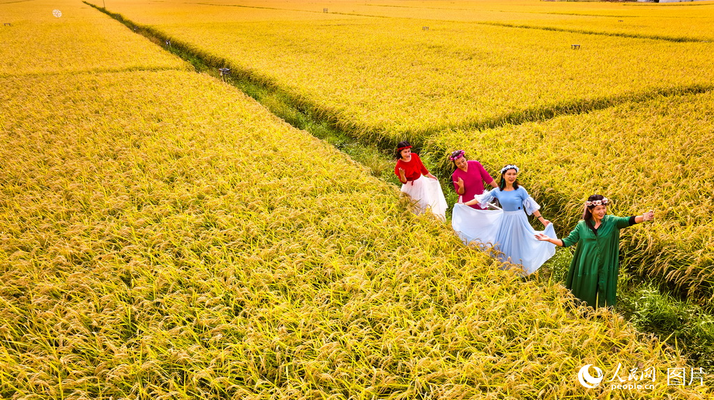Tourists pose for a picture on a rice field in Ulanhot city, north China's Inner Mongolia Autonomous Region. (Photo/Shi Jiamin)