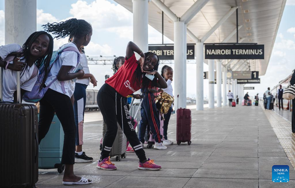 Children wait to board a train at the Nairobi Station of the Mombasa-Nairobi Railway in Nairobi, Kenya, Oct. 6, 2023. (Xinhua/Wang Guansen)