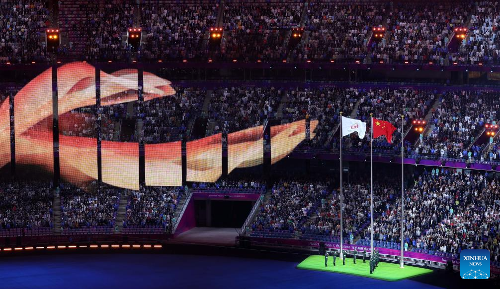 The Chinese national flag is raised during the closing ceremony of the 19th Asian Games in Hangzhou, east China's Zhejiang Province, Oct. 8, 2023. (Xinhua/Yang Lei)