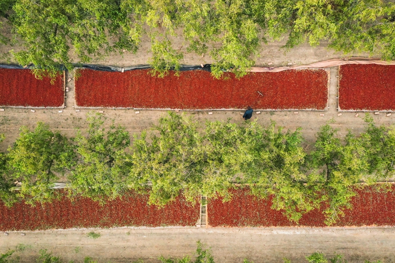 Photo shows a bird's-eye view of sun-drying fields of golden-silk jujubes in Laoling city, east China's Shandong Province, Oct. 8, 2023. (Photo/Jia Peng)