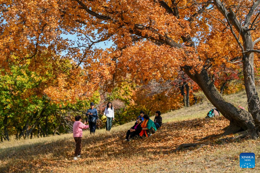 Tourists view maple trees at a forest park in Horqin Left Wing Rear Banner of Tongliao City, north China's Inner Mongolia Autonomous Region, Oct. 14, 2023. (Xinhua/Lian Zhen)