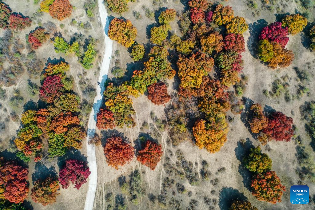 This aerial photo taken on Oct. 14, 2023 shows the autumn scenery of a forest park in Horqin Left Wing Rear Banner of Tongliao City, north China's Inner Mongolia Autonomous Region. (Xinhua/Lian Zhen)