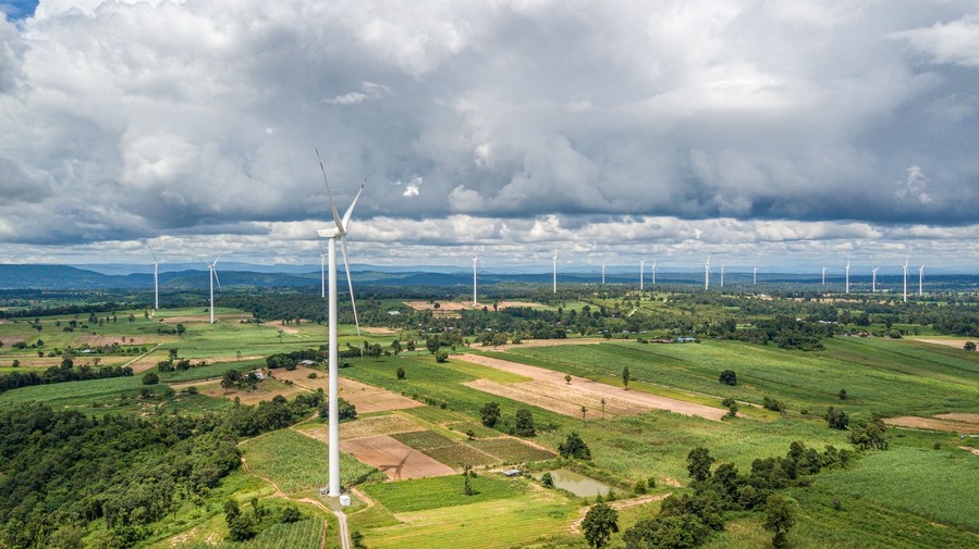 This aerial photo taken on Oct. 5, 2023 shows China's Goldwind wind turbines in Chaiyaphum, Thailand. (Xinhua/Wang Teng)