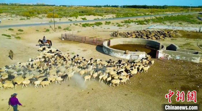 Sheep are guided to a bathing site. (Chinanews.com/Jiayabatu)