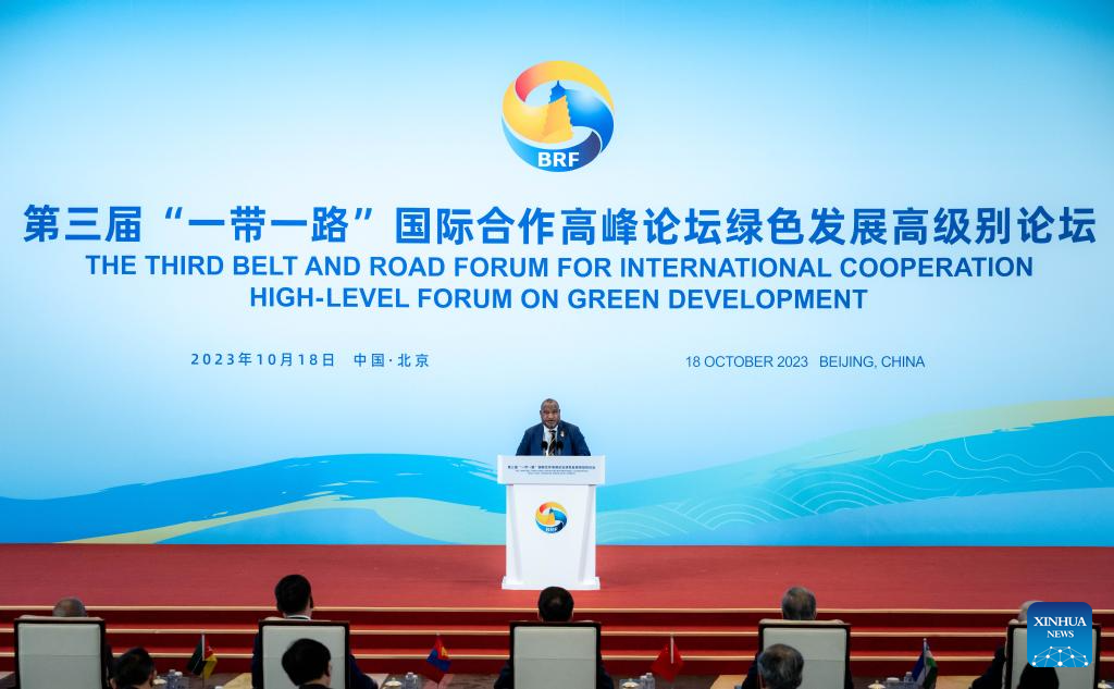 Prime Minister of Mozambique Adriano Maleiane addresses the High-Level Forum on Green Development of the third Belt and Road Forum for International Cooperation in Beijing, capital of China, Oct. 18, 2023. (Xinhua/Zhai Jianlan)