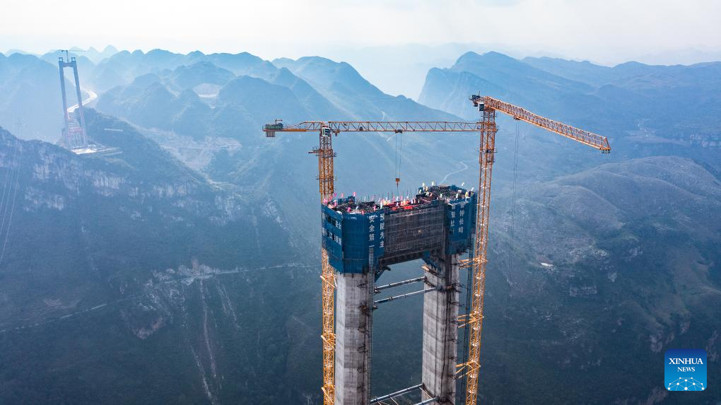 GUIYANG, Oct. 24 (Xinhua) -- The last main tower of the Huajiang grand canyon bridge was completed on Tuesday in southwest China's Guizhou Province, marking a major milestone in the building of the world's highest bridge.