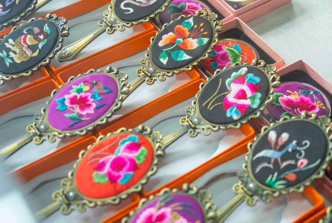 Photo taken on Oct. 28, 2023, shows embroidery accessories displayed in Shidong town, Taijiang county, southwest China's Guizhou Province. (People's Daily Online/Yang Qian)