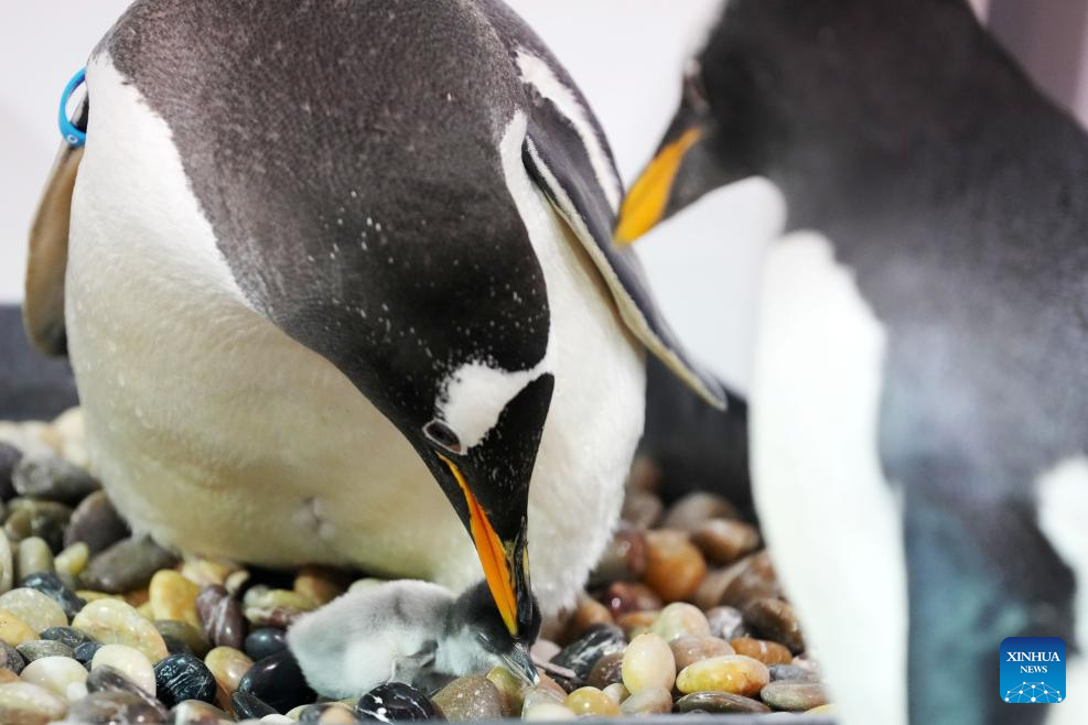 Penguin parents take care of their newborn baby in turn at Harbin Polarland in Harbin, capital of northeast China's Heilongjiang Province, Nov. 8, 2023. (Xinhua/Wang Jianwei)