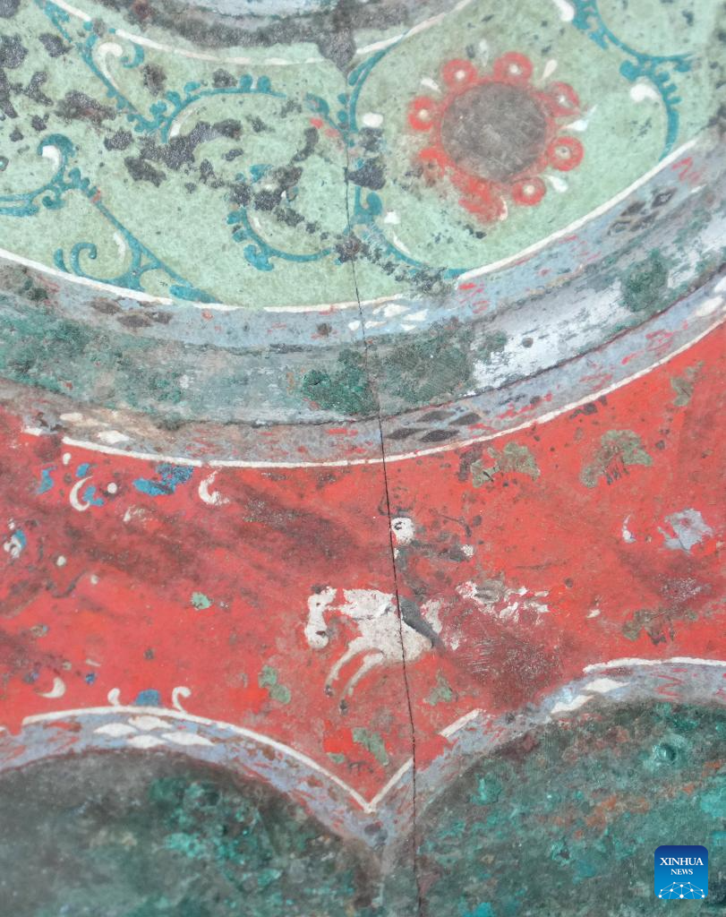 This photo taken on Aug. 25, 2023 shows part of a bronze mirror with colored patterns of figures, horses and carriages, collected at Xi'an Museum in Xi'an, northwest China's Shaanxi Province. (Xinhua/Wang Yuguo)