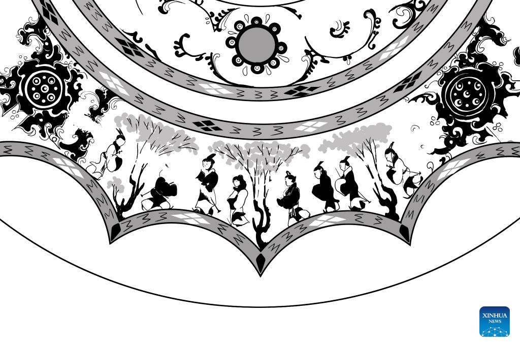 This draft shows part of a bronze mirror with patterns depicting an audience activity, collected at Xi'an Museum in Xi'an, northwest China's Shaanxi Province. (Xinhua/Li He)