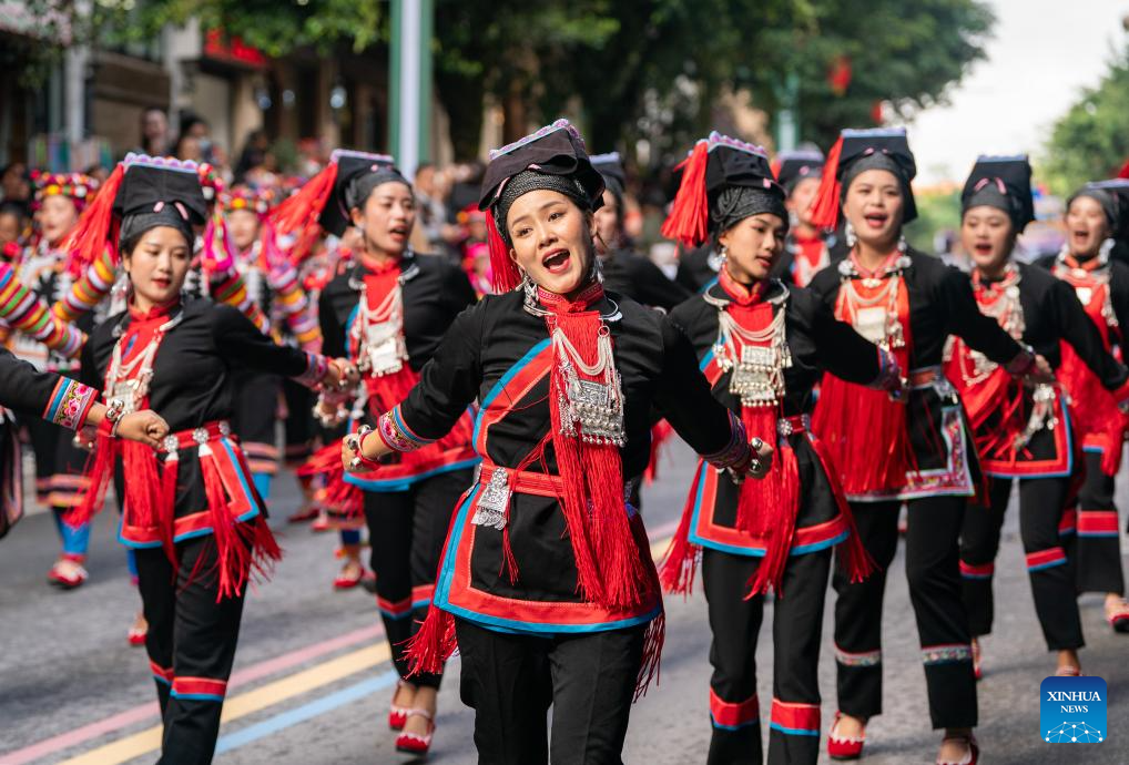 Local residents of Hani ethnic group attend a parade during a cultural tourism festival in Luchun County of Honghe Hani and Yi Autonomous Prefecture, southwest China's Yunnan Province, Nov. 19, 2023. The long street banquet, a time-honoured tradition of Hani ethnic group in China, was held here during a cultural tourism festival on Sunday. (Xinhua/Chen Xinbo)
