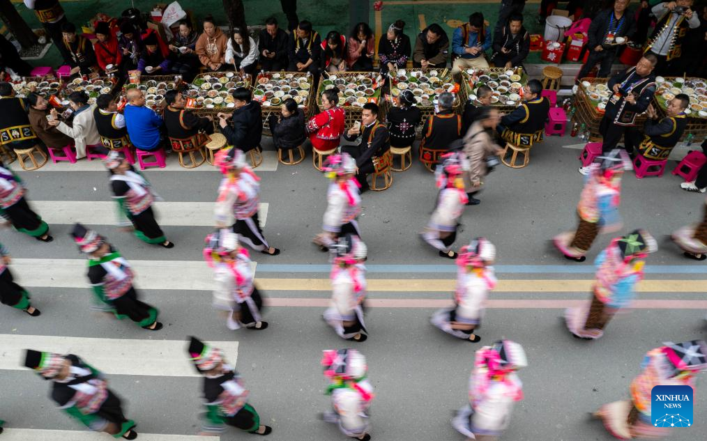 Tourists and local residents take part in the long street banquet during a cultural tourism festival in Luchun County of Honghe Hani and Yi Autonomous Prefecture, southwest China's Yunnan Province, Nov. 19, 2023. The long street banquet, a time-honoured tradition of Hani ethnic group in China, was held here during a cultural tourism festival on Sunday. (Xinhua/Chen Xinbo)